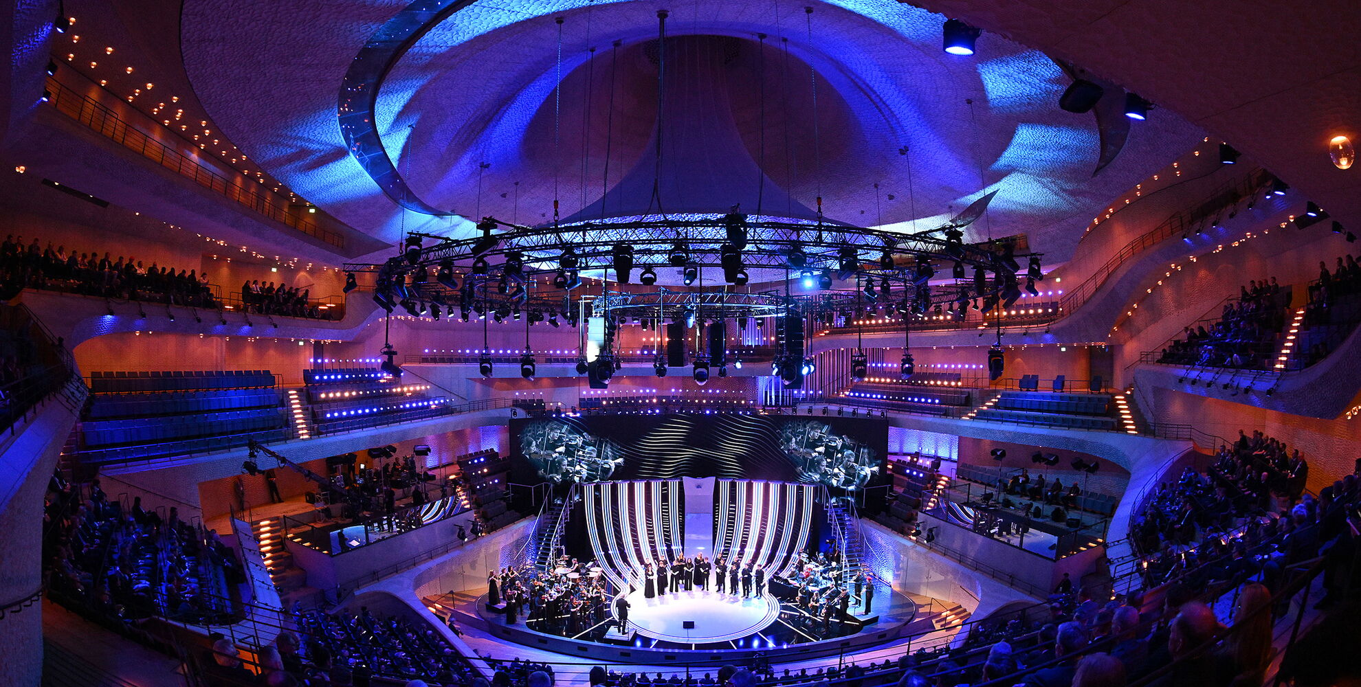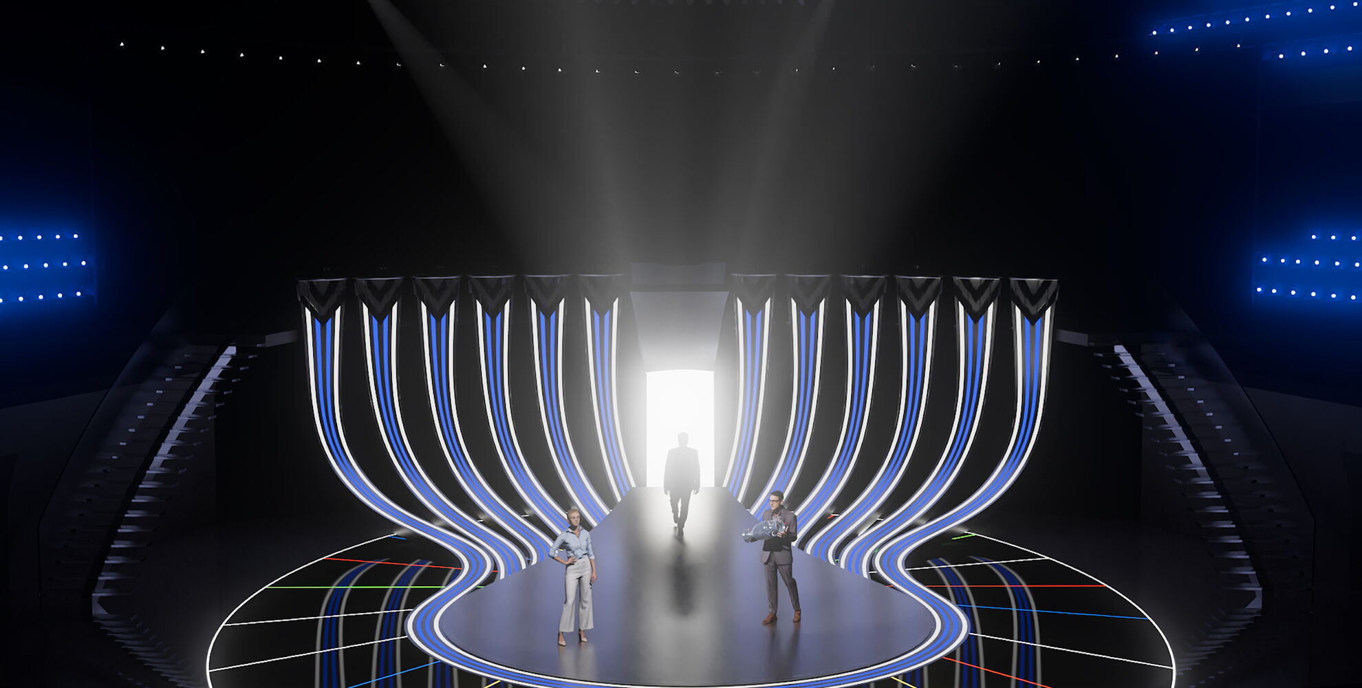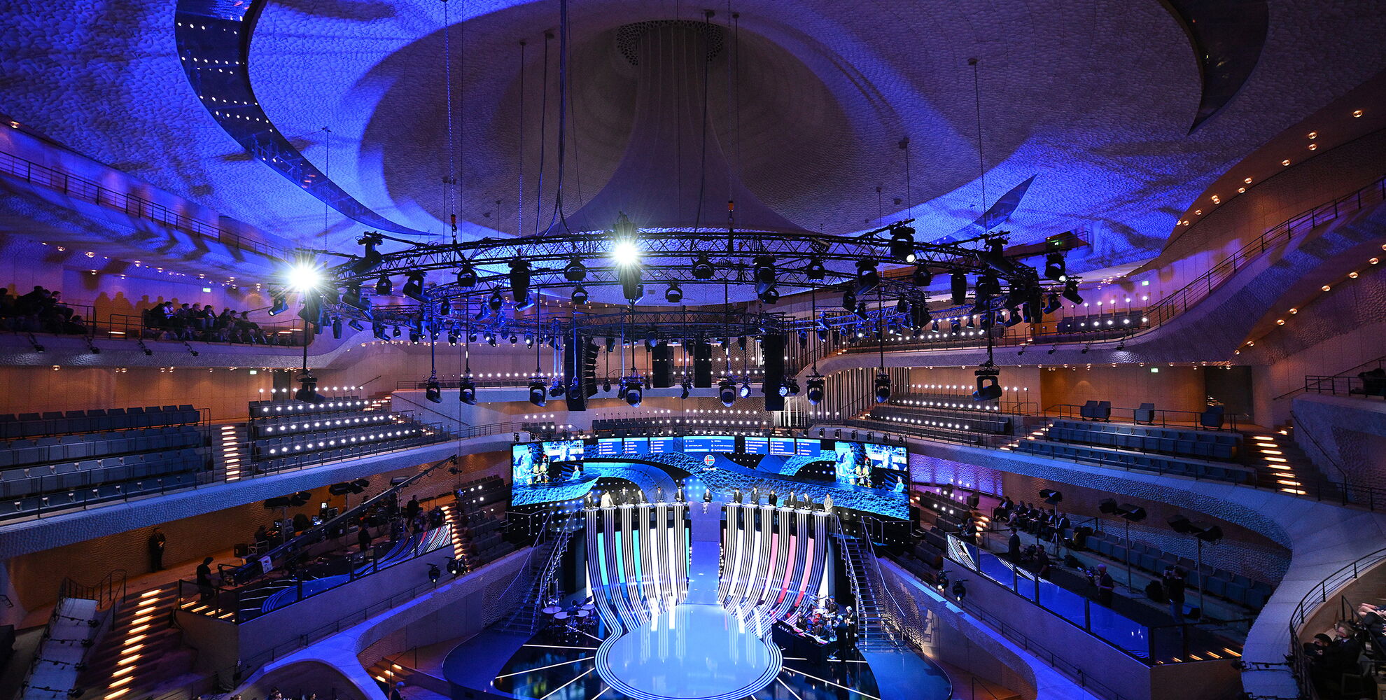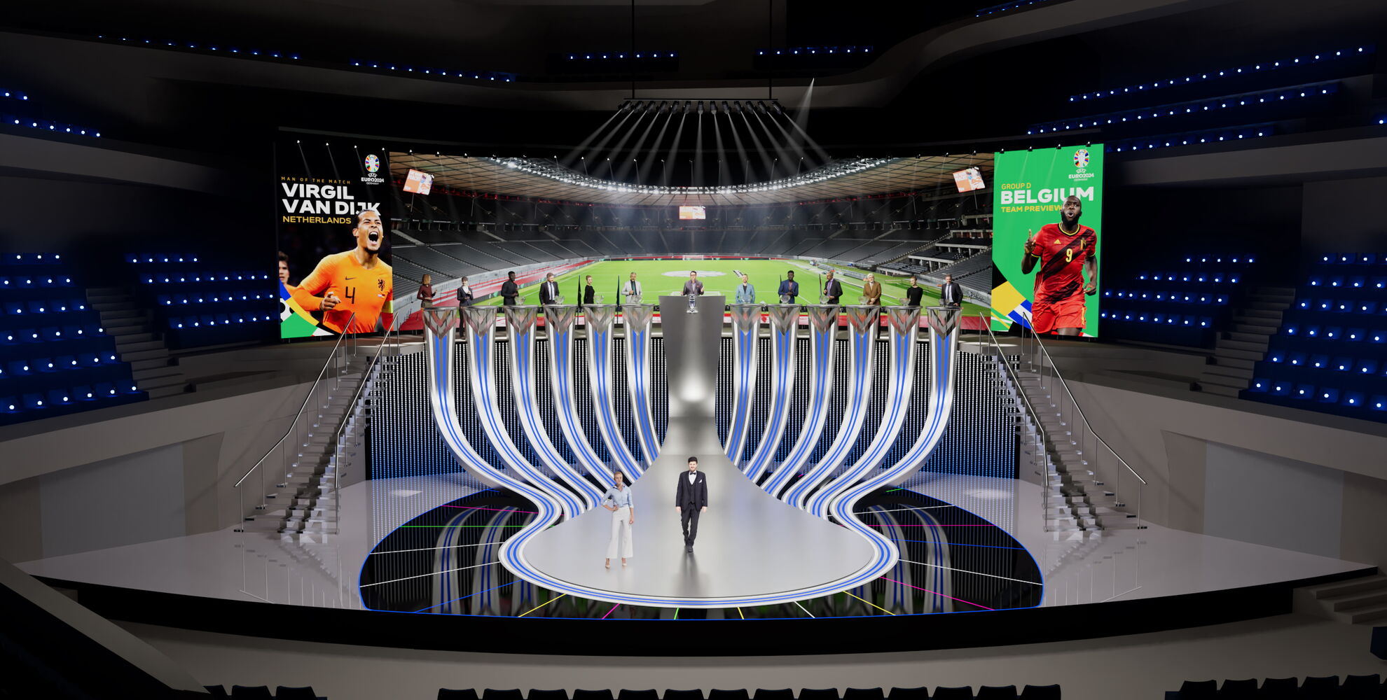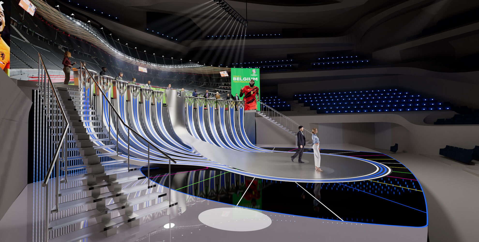 Es war zweifelsohne eine der spannendsten Herausforderungen, die man auf dem Tisch haben kann. Das Ziel, ein symmetrisches Event-Design für die UEFA-EM 2024 Verlosung innerhalb der asymmetrischen Architektur der Hamburger Elbphilharmonie zu realisieren, verlangte eine vertieften Blick in die Charakteristik dieses Raumes. Die Elbphilharmonie, berühmt für ihr lebendiges Innenraumkonzept, bietet eine spektakuläre Bühne, konfrontierte uns aber ebenso mit einigen gestalterischen Knackpunkten.